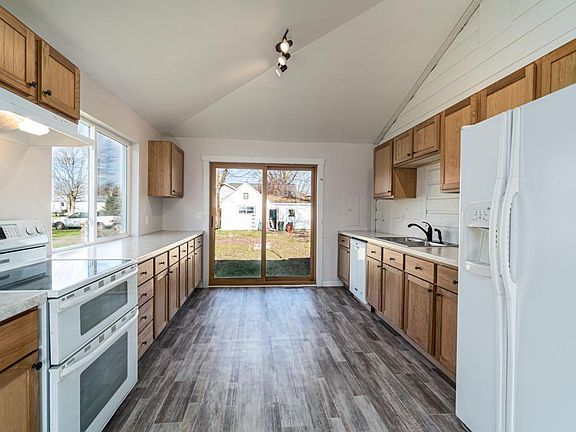 Beautiful 2 bedroom bungalow recently renovated. Bright and Airy kitchen/dining area, generous size living room, main floor bedroom w/large closet, full bath and laundry area. Upper level boosts a massive 2nd bedroom. Sliding doors off kitchen, leading to the large yard and detached garage. Home is situated on a corner lot w/covered porch. New 2022~ Well, Plumbing, electric, bathroom, hot water heater, kitchen cabinets, sink and counter tops, flooring and light fixtures. Newer roof and siding and windows. Natural gas furnace and city sewer. Kitchen appliances included.