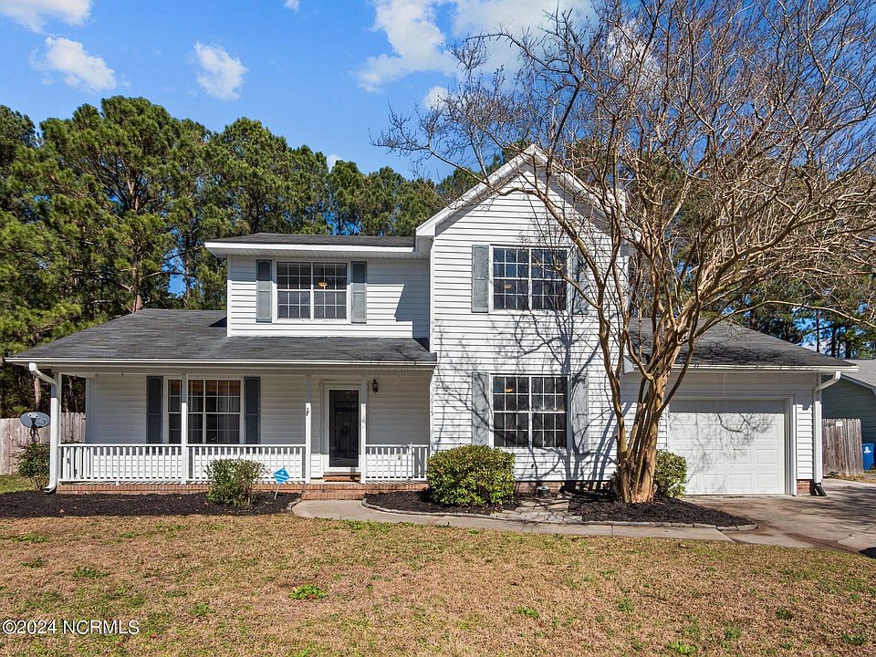 This adorable 3 bedroom, 2.5 bathroom home is the epitome of comfort and style. Located on a peaceful cul-de-sac, this residence offers everything you've been searching for. Step inside and be greeted by the warmth of the cozy wood burning fireplace in the bonus room, perfect for relaxing evenings with loved ones. The open-concept layout seamlessly flows into the updated kitchen, featuring granite countertops, stainless steel appliances, and a formal dining area for hosting memorable gatherings. Upstairs, you'll find three bedrooms, including a generous sized master suite complete with an en suite bathroom and a spacious walk-in closet. New carpet and fresh paint throughout the home provide a modern touch, while the downstairs laundry closet adds convenience to your daily routine. Outside, the wooden deck beckons you to unwind and enjoy the tranquility of the private fenced yard. Additional features include a one-car attached garage, perfect for storing your vehicles and outdoor gear, a storage shed, and a new water softener system for added convenience. This home is just moments away from shopping, restaurants, schools, and the main gate at Camp Lejeune.