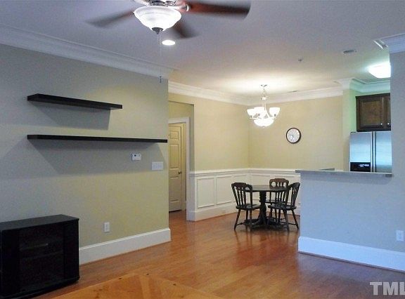 Upscale cozy condo on the 1st level which includes a secure building access and near RTP. This offers wood floors, all appliances, double crown molding, wainscoting and chair rails within a flowing, livable floor plan. Large master suite with ginormous double closet and sizable bathroom. Additional on site storage facility, walking trails along the community lakes all near Cary shopping and greenways. HOA includes water/ sewer/ trash *Pool/ Club optional $120/ year.