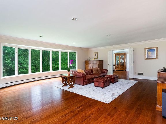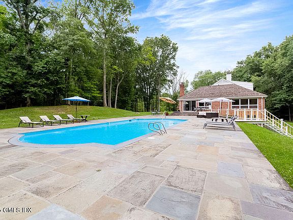 A new, private driveway leads to this 6 BR, 3.2 BA, 6,355 sq ft home set on 3 tranquil, landscaped acres with pool and patio. This spacious home features a large living room, newer kitchen (natural stone countertops), family room, den, 5 fireplaces, separate 1st floor main bedroom with vaulted ceiling, multiple office options, and a formal dining room that opens to the patio, pool and yard. The large walk-out lower level has an additional family room, powder room, wine cellar and storage. 1st Flr: 3,961 sf + 2nd Flr: 960 sf + Lower Level: 1,434 sf = 6,355 finished sf. Addt'l unfinished storage space: 1,760 sf (in attic and Lower Level). Plus 3-car garage. This lovely home offers the perfect blend of privacy and convenience to Stamford and Greenwich shops, restaurants and the train.