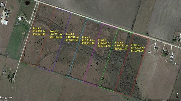 10.7+/- acre tracts offered at $5,500/ac. Located on Berger Road in Troy ISD, between Gun Club Road & Bottoms Road. Scattered trees and wet weather creek on property. Tree line provides good privacy on tracts 1-5, tracts 6 & 7 have moderately to heavily wooded sections. Mostly hardwood trees with a few scattered cedars. Outside city limits, and no city taxes. Open Space Valuation (Ag Exemption) in place for low property taxes. Some deed restrictions to be applied at sale to include: no mobile homes, no junk yards & no commercial feed lots or poultry operations.