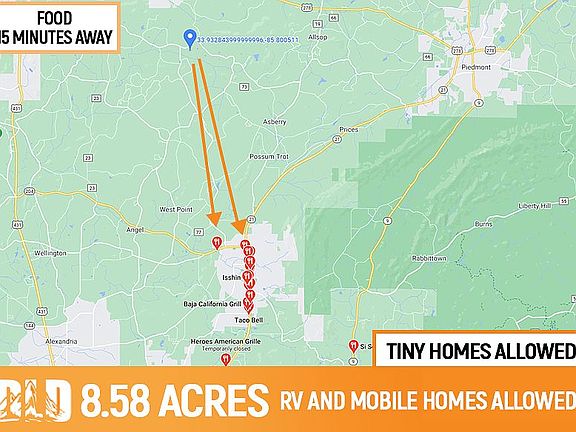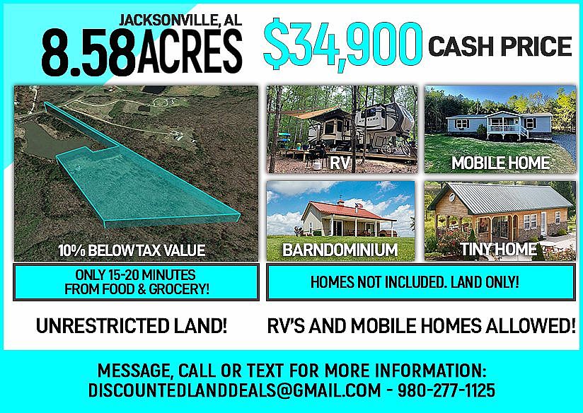 8.58 acres in Jacksonville, AL **UNRESTRICTED LAND - RV’s, Tiny, and Mobile Homes Allowed!** 10% Off Tax Value! Discounted Cash Price: $34,900 What an opportunity! Don’t miss your chance at such an outstanding deal on this UN-RESTRICTED 8.58 acres in Jacksonville, AL. Have you been looking for that elusive piece of unrestricted land that’s so hard to find, or property in the perfect location but just can't find the one for the right price? We have the perfect opportunity for you! Take advantage of this awesome deal, located in Calhoun County, AL! This 8.58 acre property is the perfect location to see your dreams come true. As unrestricted land, your options are unlimited - RV/Campers, mobile homes, modular homes, tiny homes, site built homes, anything goes you choose! This property has enough room to do it all plus some! Enjoy h0rse trail riding, off-road atvs, target practicing, hunting, or anything your mind allows! This will likely be the best deal you will find today in the Jacksonville, AL area! Don’t Miss out on this INCREDIBLE DEAL! Property Details Address: 6150 New Liberty Rd Jacksonville AL 36265 County: Calhoun APN (Assessor’s Parcel Number): 07-02-04-0-000-005.000 GPS Coordinates to locate property: 33.932844, -85.800511 Lot size: 8.58 Acres Type of Home(s) Allowed: RV, Mobile Home, Tiny Home, Barn dominium, Modular, and Stick Built Home Septic: septic installation needed Water: Provided by Calhoun County Water Authority Electricity: Service provided by Cherokee Electric Cooperative Annual Property Tax: $53.04 Food 15 minutes away Grocery 20 minutes away Pharmacy 18 minutes away Hospital 20 minutes away Birmingham 1hour 20 minute drive Huntsville 2 hour drive Atlanta 2 hour drive Make this property YOURS for a cash discounted price of $39,900! We are motivated to sell - All cash offers will be considered! Message, call, text or email us today to get started. We make it super easy for you! 980-277-1125 discountedlanddeals@gmail.com Visit our Facebook page at www.facebook.com/discountedlanddeals to view all available properties! **As with any purchase of land, Buyer is responsible for verifying all information with the city/county as to what can and cannot be done with the property and confirm availability of any utilities/services for the property. Seller makes no warranties or representations about the land.