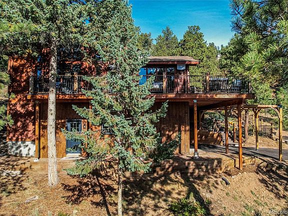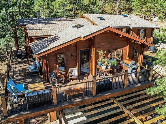 Welcome to this charming Log Home, freshly stained and nestled on a peaceful 1.62-acre lot on a quiet cul-de-sac. This beautiful property offers a perfect blend of rustic charm and modern updates, ideal for those seeking a serene mountain lifestyle with convenient access to city amenities—and best of all, no HOA restrictions. Situated just 20 minutes from C-470 and only 15 minutes from Evergreen Lake, where you can enjoy kayaking or paddleboarding, ice skating, and hiking. This location allows for quick access to world-class ski slopes, local restaurants, and only 30 minutes to downtown Denver. The home is also close to five local open space parks, with a Denver Mountain Parks Trail access in the immediate neighborhood. Inside, the home features three bedrooms (one non-conforming) and three bathrooms. The updated kitchen is open to the vaulted living room, which includes a cozy wood stove. The dining area provides a perfect space for entertaining. A recently added reading loft offers a tranquil nook to unwind. The primary bedroom is a retreat, boasting direct access to a back deck with hot tub. The spa-like primary bathroom features a luxurious open shower! A gorgeous deck runs along the front of the home, capturing stunning mountain views and providing an ideal space for morning coffee or evening relaxation. The lower level is accessible by a spiral staircase and includes the third bedroom, a ¾ bath, a kitchenette, and an exterior access door. The lower level also offers additional storage and opens up to what was once the garage, now used a versatile living area with epoxied concrete floors—easily converted back to a garage if needed. Zoned A-2, this property offers endless possibilities and flexibility for your lifestyle. This area is served by the excellent Jefferson County School District. Don’t miss the opportunity to make this unique property your own!