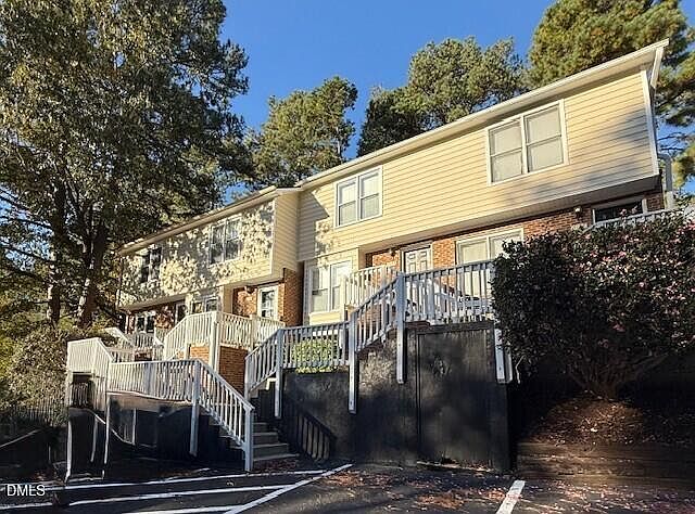 Beautifully updated end-unit townhome in a prime Raleigh location! Enjoy the convenience of nearby restaurants, shopping, and quick access to I-540 and I-440. This stylish home features hardwood floors throughout the main level, an inviting eat-in kitchen with crisp white cabinetry, stainless steel appliances, granite countertops, and a modern tile backsplash. The spacious living room offers a cozy gas fireplace and opens to a private deck overlooking serene wooded views ideal for relaxing or entertaining guests. A stackable washer and dryer are included for your convenience. Upstairs, you'll find hardwood flooring throughout, generous bedrooms with large closets, and updated bathrooms featuring contemporary finishes. This home combines comfort, convenience, and charm and it's move-in ready! Don't miss this opportunity apply today!
