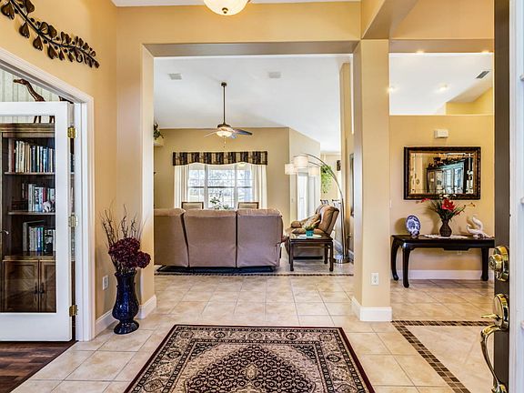 STUNNING HOME LOCATED ON PRESTIGIOUS GOLF COURSE! Foyer opens to great room featuring cathedral ceiling and plant shelves. Kitchen with lots of cabinets, granite counters & newer appliances. Custom tile backsplash & snack bar open to great room. Master suite w/ tray ceilings & French doors leading to lanai. Master bath w/ double door entry features raised vanity, double sinks and cultured marble countertops, Garden tub for ''bubble bath'' relaxation and large walk-in shower. Oversized two car plus golf cart garage. Built-in shelving and workbench for handyman. Deep covered lanai w/ step down to screened area includes fountain. Open patio for relaxation. Located on 11th hole with fabulous golf views! Producing lemon tree. CHAIN OF LAKES ACCESS in this 24/7 manned security and gated communit