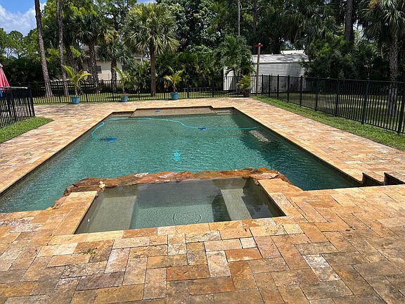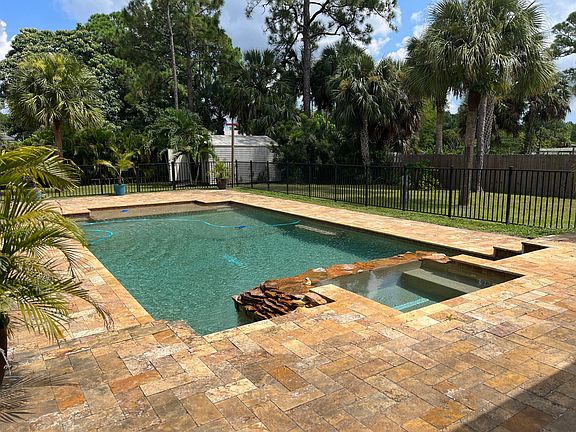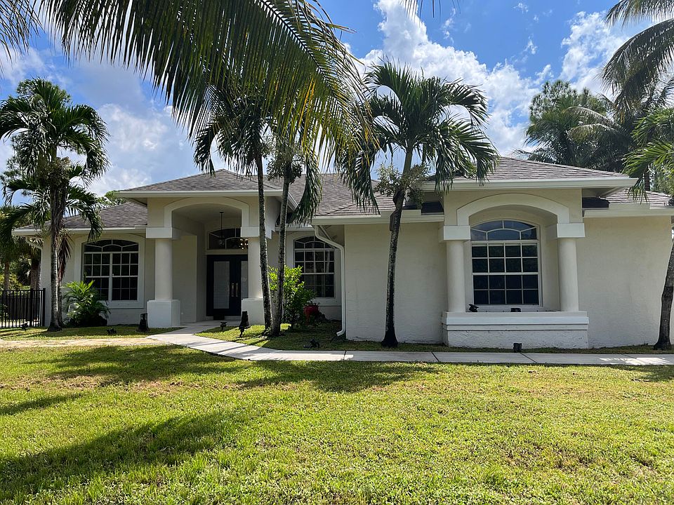 Beautifully appointed house located in the best part of the acreage with quick and easy access to Turnpike and major throughfares. One acre plus with mature pine and Royal palm trees adorn this exceptional property.Three bedrooms plus a large office/den, high cathedral ceilings, new kitchen with quartz countertops; freshly painted interior/exterior, under the roof patio, new Ac condenser 2023 and new compressor 2021.New roof installed 2019. New gutters installed 2023Custom shed with 220 V electrical and generator that can power the entire house.Oversize 18/36 pebble Teck Heated pool and spa with remote temperature control and special lightning effects built in 2013 surrounded by aluminum fence.