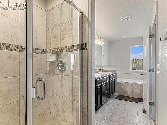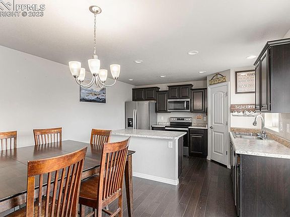 Welcome to this lovely 4-bedroom property, featuring a massive fenced backyard perfect for outdoor enjoyment and privacy. Inside, you'll find excellent finishes throughout, creating an atmosphere of comfort and style. The large eat-in kitchen, complete with stainless steel appliances and a spacious island, is ideal for hosting guests and culinary adventures. The master suite offers a touch of luxury with a double vanity, tub, and standing shower, providing a spa-like retreat within your own home. Plus, with its convenient location just minutes away from Fort Carson Army Base, this property combines the best of comfort and accessibility for a truly exceptional living experience.