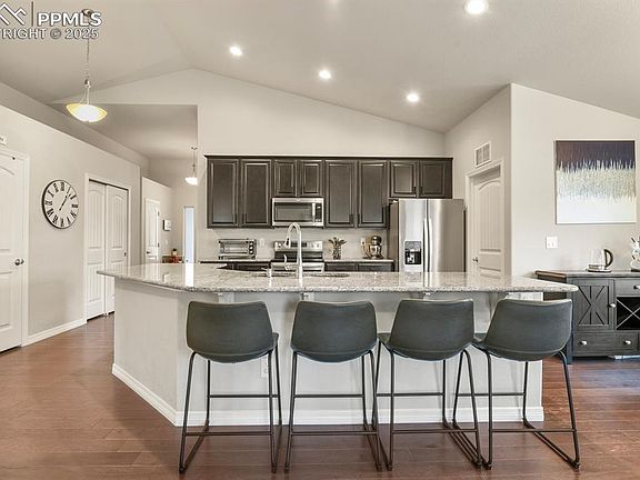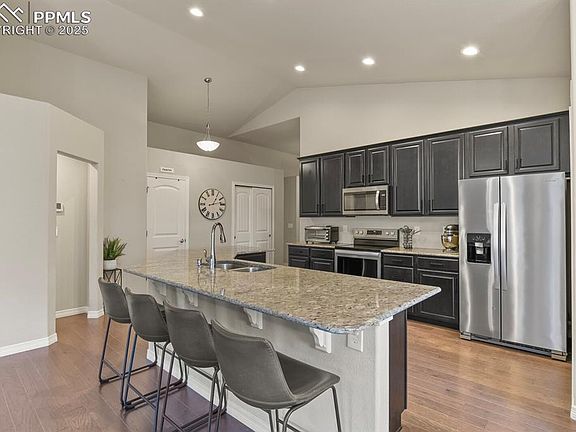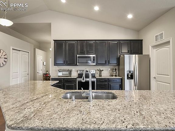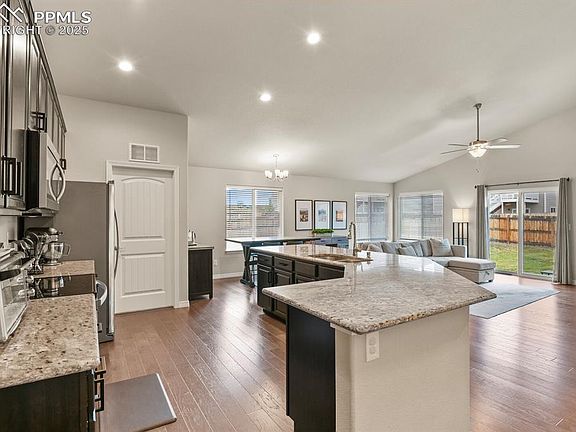 Charming Ranch with Open Floor Plan and Designer Touches! Welcome to this beautifully upgraded 3-bedroom, 2-bath ranch home with a spacious 3-car garage, nestled in a prime location near shops, restaurants, and Fort Carson. This desirable open-concept floor plan features soaring vaulted ceilings and abundant natural light, creating a bright and airy atmosphere throughout. The gourmet kitchen is a chef’s dream, complete with granite countertops, stainless steel appliances, a walk-in pantry, and generous cabinetry for all your storage needs. Thoughtful upgrades continue throughout the home include recessed lighting, luxurious custom-tiled shower in the primary suite, and hardwood floors throughout the common areas. Two additional bedrooms, a full bath, and a laundry room offer convenience and functionality. Step outside to your fenced backyard featuring a cozy patio—perfect for relaxing or entertaining. This home blends style, comfort, and convenience—don’t miss your chance to make it yours. Schedule your showing today!