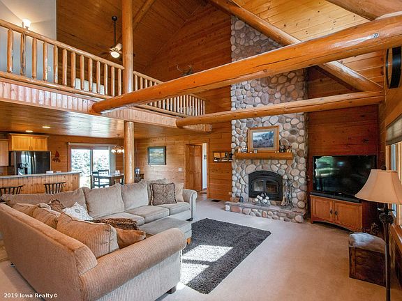 Find your peace on this picturesque acreage surrounded by trees. This beautiful Log home sits on a high point which affords spectacular views of open pastures and rolling green space from every room. 3 bedrooms plus a large bonus room and loft area adds flexible space. Large First floor master with nice sized bath and big walk in closet. Open entertaining space includes the family room with soaring ceilings and a warm, cozy stone wood burning fireplace. Spacious kitchen with new slate appliances and tiled floors. Theater room in walk out lower level plus tons of storage and room to grow Geothermal makes it super-efficient The iconic red barn is perfect for toys and a workshop. A stamped concrete patio completes the space. Close to Chichaqua Valley Trail Only 30 minutes to Des Moines. Come home to this quiet, private and serene paradise