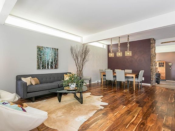 Mid 20th century modern with sunken game room. This is a unique home with 17 mature ponderosa pine trees in throughout the yard. Huge round entertainment room and designer kitchen. Huge master bedroom with his and hers walkin closets, excersise room and sitting room off master.
