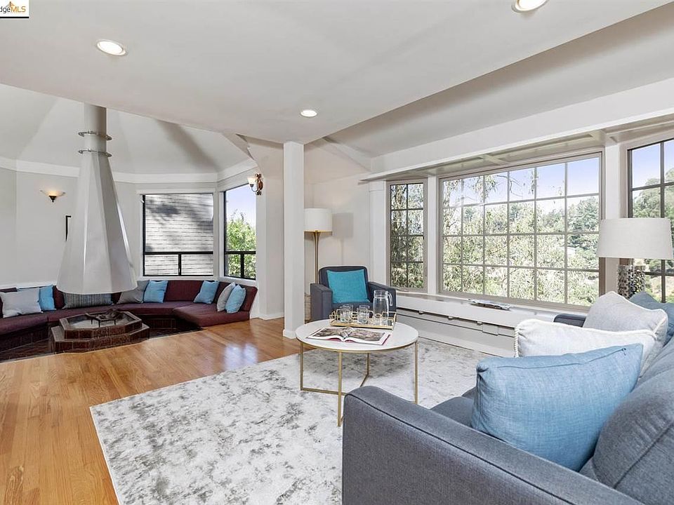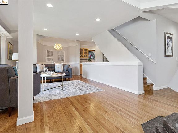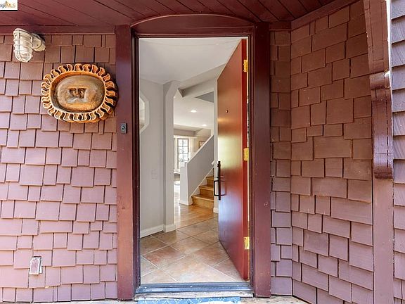 This elegant and unique home is nestled in the woods of Piedmont Pines with abundant windows overlooking sweeping canyon views. The spacious living area boasts an inviting one-of-a-kind fireplace conversation area for friend and family gatherings. It includes a formal dining area, features gorgeous hardwood floors and flows into the kitchen with newer appliances. Multiple decks enhance the indoor-outdoor living experience. Downstairs the master bedroom is light filled and generous in space and the master bath has been recently updated. There are two additional bedrooms, including one on the main level. Venture down the wood-lined secret staircase to a special wine cellar and bonus space. Find another bonus room, perfect for an office, above the main level on the way to the two car garage. There is tons of storage space and it is near the sweet Montclair Village and easy commute access, just minutes from BART and freeways.