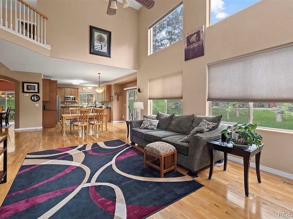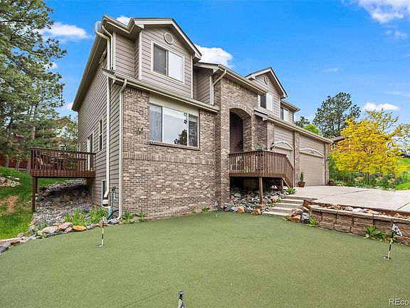 Exceptional home with many unique designer accents and upgrades galore! Open floor plan, light and bright home with lots of wonderful window openings, bringing nature into the home. Spacious kitchen with beautiful granite counters, stainless appliances including a double oven, pantry and plenty of cabinets and counter space. Quality wood flooring throughout the main floor. Formal dining room off the kitchen features a quaint bonus balcony, a charming place for morning coffee or end of the day cordials. Adjacent to the kitchen is an informal dinning area with room enough to host a large gathering. The great room also features a generous living room with cathedral ceiling and many impressive windows. A spacious patio is off the great room with views of trees, gardens and the frequent deer and wild turkeys that come trouncing through the back yard. A beautiful open staircase leads to four bedrooms on the second floor. The primary suite is spacious and elegant with a five piece bath, including a soaking tub, a walk-in closet and yet another impressive picture window with forest views. The open hallway between the primary bedroom and the guest bedrooms overlooks the great room and entry from the second floor for an impressive affect of spaciousness. The outdoors is filled with nature unique to The Pinery and also displaying custom stone and petrified wood accented gardens that are marvelous. Oversize three car garage, lots of room for cars and grownup toys. Newer roof, newer trex decking, newer paint and in general an especially well cared for home. "The Pinery is a community with mountain views, wild flowers and wildlife galore. It is away from the hustle and bustle of the city but is quite near to Parker," The Pinery Home Owner's Association.