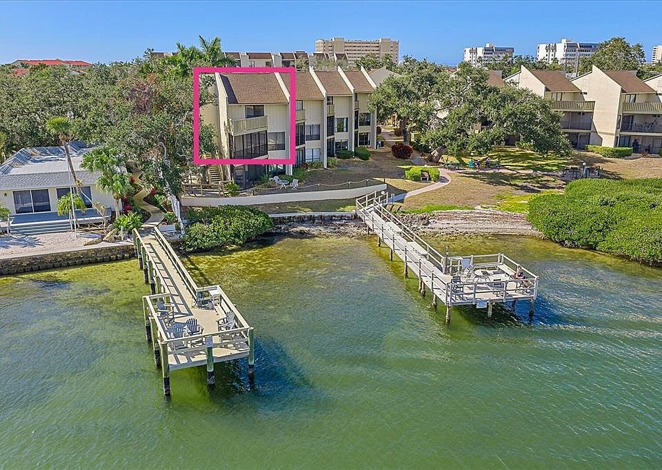 One or more photo(s) has been virtually staged. A true SIESTA KEY DIAMOND IN THE ROUGH, this rare waterfront residence offers what may be the most breathtaking Sarasota Bay intracoastal view in the entire Bay Oaks community—a view that feels endless, cinematic, and utterly transformative. Positioned directly on the water, this second-floor, two-level, two-bedroom, two-and-a-half-bath condo is a blank canvas waiting for someone with vision to unlock its full potential and create something truly extraordinary. Once reimagined, this home could be an absolute showstopper, whether as a deeply personal coastal retreat or a high-performing investment with weekly rentals permitted. The main living level features the living room, dining area, kitchen, in-unit laundry, and a convenient half bath for guests, while both generously sized bedrooms are located upstairs, each with private ensuite baths and large walk-in closets. One of the primary suites opens to a private, open-air covered balcony that faces directly over the bay—an intimate perch for morning coffee, sunrise reflections, and quiet moments where the water becomes part of daily life. Build-out renderings have been thoughtfully created to help visualize just how breathtaking this residence could become once updated. Bay Oaks itself enhances the lifestyle with a heated bayside pool, private fishing pier, waterfront picnic and BBQ areas, tennis and pickleball court, clubhouse with kitchen, pool table, and library, assigned covered parking, guest parking, covered bike storage, onsite management, and 24-hour video surveillance. Nestled on the bayside of world-famous Siesta Key, the community is surrounded by lush tropical landscaping, majestic live oaks, and swaying palms, with direct access to Sarasota Bay for kayaking, fishing, or simply soaking in the sunrise. The powdery white sands of America’s #1 Beach are just one mile away, and the free Siesta Key trolley stops directly outside the community. Upcoming community improvements—already paid for—include parking lot resurfacing, renovated carports following the 2026 season, and new pool furniture. This is an opportunity to fall in love not just with what this property is today, but with what it has the power to become—a waterfront home where vision meets view, and where the Florida lifestyle unfolds beautifully over the bay.