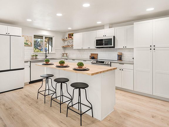 Nestled in the heart of Bend, this beautiful single level, open floor plan, 3 bedroom, 2 bathroom home has been completely remodeled and updated throughout. The light and bright kitchen boasts new cabinets, new Samsung appliances, quartz countertops and a butcher block island. New heating/air conditioning, gas fireplace, and wood burning fireplace give this home 3 heat sources to stay warm during Central Oregon winters. Large primary suite featuring his/her closets, modern bathroom with tile shower and new fixtures. Yard features a large covered patio, irrigated lawn, fire pit seating area, mature fruit trees and old growth trees in addition to room for a shop, boat/RV parking and more. Conveniently located in close proximity to Larkspur Community Center, Alpenglow Park, the Old Mill District and Deschutes River access.