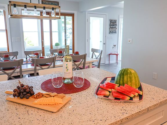 Features include a full kitchen with stainless steel appliances, a dining area overlooking the lake, a beach-themed sunroom, and a basement with a fitness room and game area (ping-pong, foosball, and air hockey). Spacious bedrooms, comfortable living areas, and a lakeside deck make this home a warm and inviting retreat year-round.