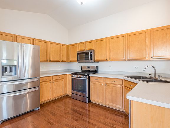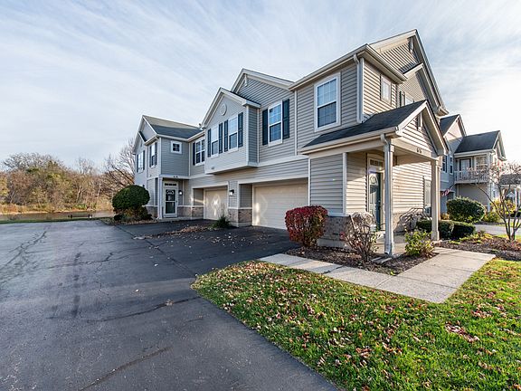 Nothing to do but move in! New carpet, fresh paint, new water softener and professionally cleaned! Open floor plan with vaulted ceilings, Large eat in kitchen with Maple cabinets, hardwood floors, breakfast bar and pantry. All open to spacious living room. 3 bedrooms, 2 full baths. Master has full private bath with seated shower, glass doors and double sink. Walk in closet with shelving. Balcony off living room with screen door. Laundry closet in unit. All major mechanicals have been serviced and are ready to go. 2 car garage is insulated and has lofted storage space. Just steps to walking trail and pond from back of unit. Short walk to Heritage Park. Being sold AS-IS.