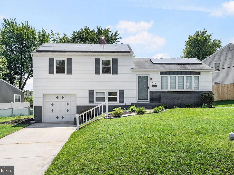Welcome to this beautifully landscaped split-level home, where classic charm meets modern updates. As you step inside, you're greeted by refinished hardwood floors that flow through the living and dining rooms, creating a warm and inviting atmosphere perfect for entertaining guests or enjoying a quiet evening at home. The updated kitchen is a chef's dream, featuring 42" cabinets, quartz countertops, a custom tile backsplash, and stainless steel appliances. Whether you're preparing a gourmet meal or a quick snack, this kitchen is both stylish and functional. Upstairs, the spacious primary bedroom offers dual closets and gleaming hardwood floors, providing a serene retreat at the end of the day. The full bathroom is beautifully appointed with a custom tile surround and a tub/shower combo, perfect for relaxing after a long day. Two additional bedrooms on this level, both with hardwood floors, offer comfort and versatility for guests or family. On the lower level, you'll find an additional bedroom with tile flooring and a fully updated bathroom with a custom tile surround, which can easily be used as a home office or a guest bedroom. The finished basement provides extra living space, ideal for a family room, media room, or play area. This level also includes a utility room and plenty of storage space. Step outside to the fully fenced backyard, an ideal setting for summer BBQs and outdoor gatherings. The shed offers additional storage for all your gardening tools and outdoor equipment. Plus, the one-car garage is a welcome feature during those chilly winter months. Conveniently located near routes 97, 100, BWI, and an array of restaurants and shops, this home offers both comfort and accessibility, making it the perfect place to call home. Don’t miss out! Schedule your showing today! Updates include: fresh paint, kitchen floor, kitchen appliances, bathrooms and lighting and a french drain installed (2024). The solar panels are leased through TESLA.