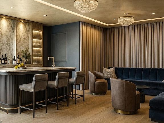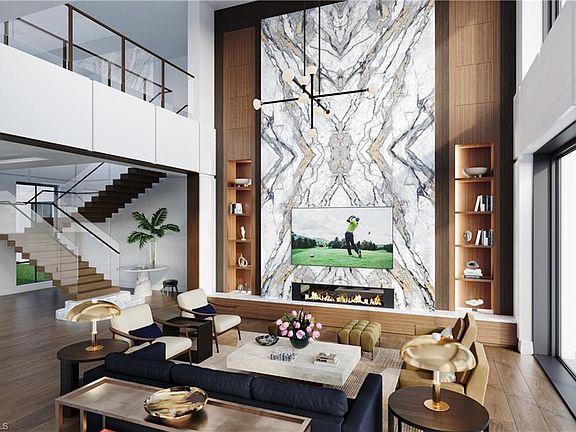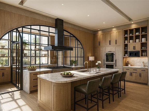 Commanding a rare, western lakefront view in Old Naples, this new construction estate redefines scale, craftsmanship, and architectural clarity. Encompassing over 9,400 square feet of interior living space, the home was conceived as a private resort - where every element supports both the grand and granular aspects of daily living. Twin infinity-edge reflecting pools frame the entrance, opening into a dramatic two-story great room with precision millwork, architectural symmetry, and a sculptural floating staircase. Adjacent, a formal dining room is anchored by a custom, glass-enclosed wine wall integrated into bespoke cabinetry. The kitchen, defined by a curved steel-and-glass partition, includes Wolf/Sub-Zero appliances, dual Miele coffee stations, and a concealed butler’s pantry equipped for large-scale entertaining. Subtle finishes and architectural restraint elevate the overall atmosphere. The first-floor primary suite is entirely self-contained, featuring a private study, two oversized dressing rooms, a discreet laundry center, and a marble-clad bath with indoor/outdoor showers. Upstairs, five additional bedroom suites are complemented by a media lounge and a concealed club room with full bar and humidor. Outdoor architecture is equally refined. A 60-foot negative-edge pool extends across the rear elevation, interrupted by a series of stepping-stones that lead to a sunken firepit lounge surrounded by water. An elevated spa, covered loggia, and summer kitchen complete the space. Above it all, a detached fitness pavilion with breath-taking wide lake vistas, introducing a compelling architectural counterpoint. Additional features include 13x Toto Neorest toilets, three laundry stations, a commercial-grade sheet ironer, full-home generator, elevator, and a five-car split garage designed for collectors. A comprehensive smart home system governs all functions discreetly. Realized by New England based developer EMB Custom Homes, and executed by MHK Architecture, Lotus Construction, and Freestyle Interiors, this fully furnished residence is a singular opportunity in the Naples luxury market. An unrivaled legacy property. Completion is scheduled for January 2026.