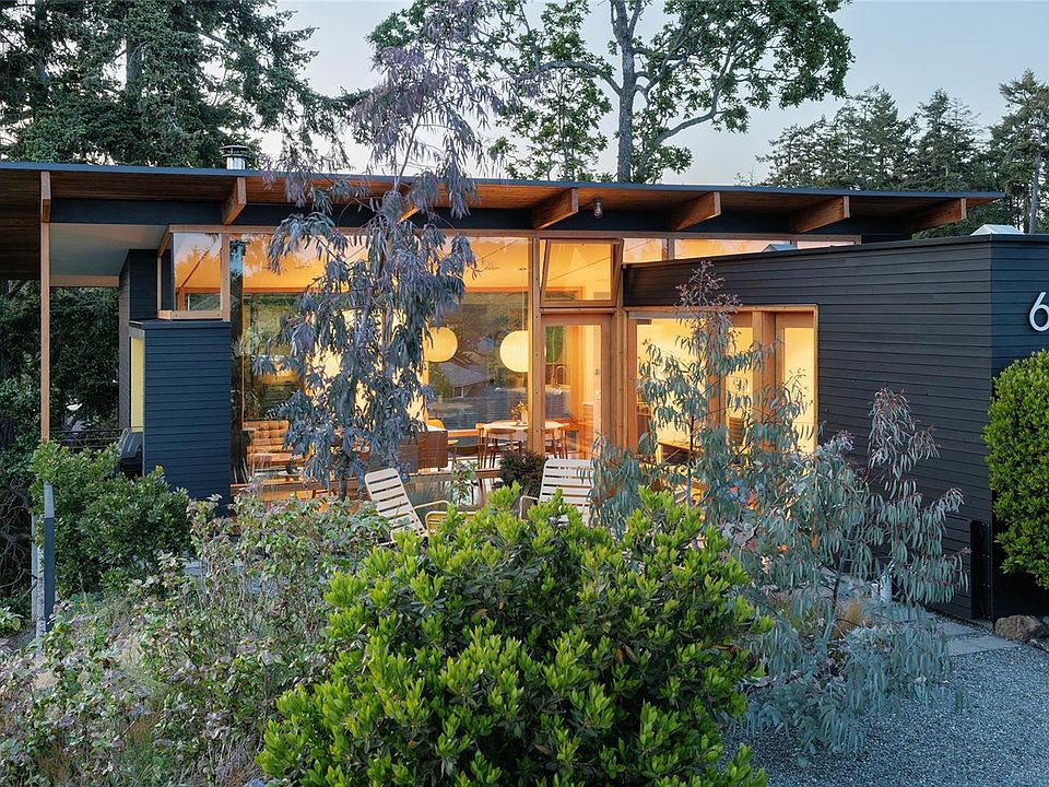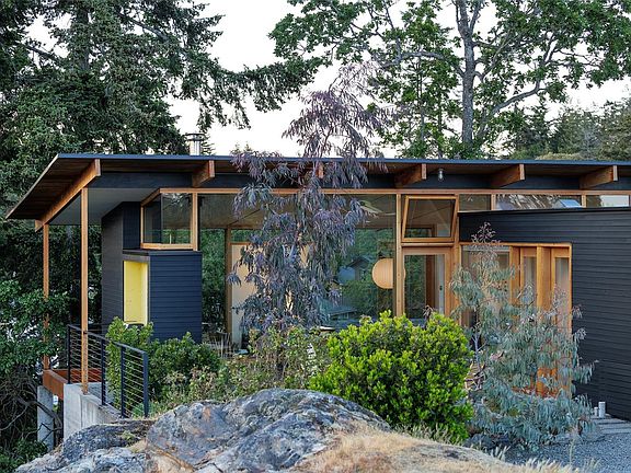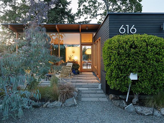 Greater Victoria's most affordable custom-built home! Welcome to 616 Cornerstone Close, a contemporary post and beam residence completed in 2012. Perched at the crest of a hill, you are set among the treetops with a functional 1 level floor plan, all framed around a suncatcher southwest courtyard. The architect inspired elements of this home are crafted to maximize natural light and feature oversized glazing, clerestory and corner windows. Open concept main living area with Morso wood stove, custom media cabinet, built-in speakers, and in-floor radiant heat throughout. Walnut cabinetry and long pulls give the kitchen a distinctly mid-century modern aesthetic and the large island with white quartz is readymade for entertaining. The bedroom wing features 2 bedrooms flanking the courtyard, including a primary bedroom with walk-in closet and ensuite. One of one!
