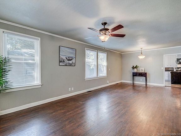 Covered front porch welcomes you to this 3 bedroom, 2 bath home with the perfect combination of charm and updates. You'll love the remodeled bathrooms; primary bath with whirlpool tub, double sinks. VINYL replacement windows, hardwood floors, tile baths, carpet free home! Updated kitchen with stainless steel appliances; all remain. Large indoor utility room with sink and storage, plenty of space for frontloaders. Fenced backyard with deck, mature trees, privacy. Detached garage, overhead door opener.