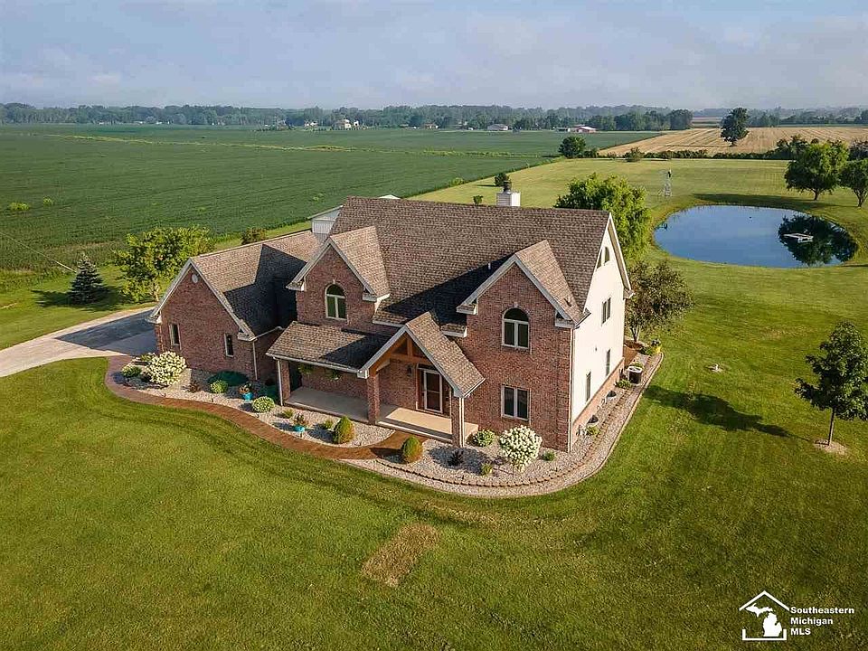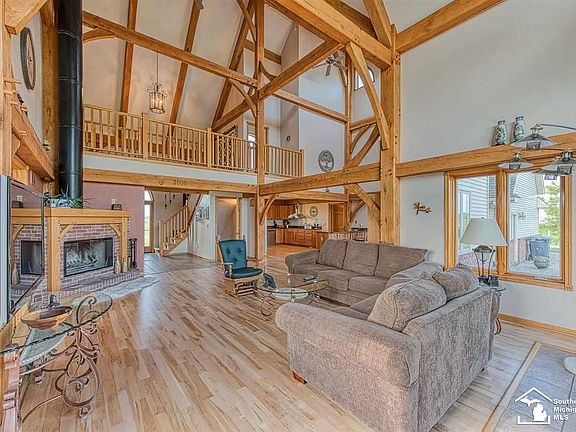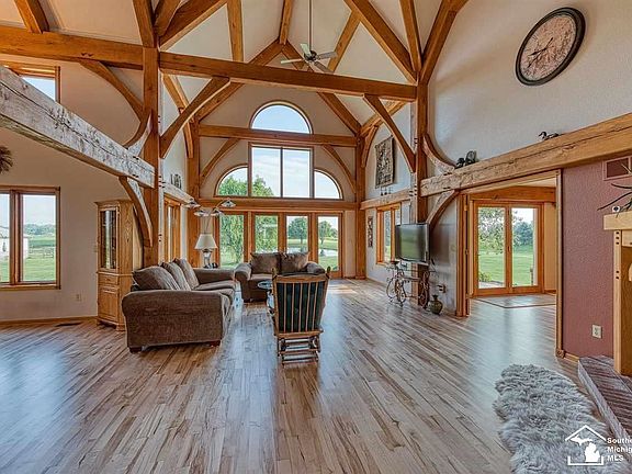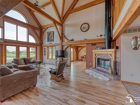Stunning Timberframe home with a lot of detail work on the interior! Cathedral Ceilings in the Great Room and Dining Room that give the home a "Lodge Look." Beautiful Stone gas starter fireplace, freshly re finished hardwood floors. Open kitchen w Granite and higher end appliances. Spacious Laundry room w/ builti int washer and dryer. Home features main floor and upper level Owners Suites. The Upper Suite features a newer bath w a walk in stone and tile shower. Basement is finished w/ a large entertainment area + a kitchenette, great for entertaining. Dual water heaters for ample hot water. Home sets on 7.8 acres w a 1/2 acre pond featuring a Kohender Windmill for aireation. 30x40 Pole Barn, attached 24x30 garage that can fit 3 vehicles. Beautiful stamped concrete patio + walkways, rear patio features a Solaris Infared built in grill. Home is a rare find!!