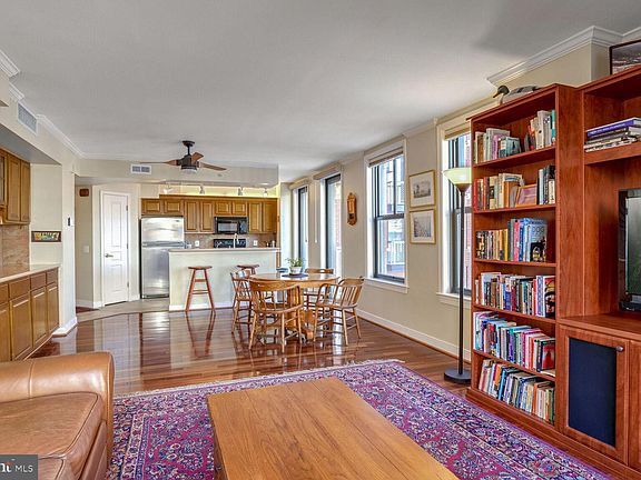 Welcome to this bright and spacious 2-bedroom condo in the highly sought-after Clara Barton. Gleaming hardwood floors flow throughout the open living and dining spaces, creating a seamless, inviting atmosphere. A stylish breakfast bar with track lighting adds a modern touch to the kitchen as well as the new Miele dishwasher. A side bar elegantly separates the dining area from the living room, which features built-in bookshelves. Near floor-to-ceiling windows flood the living area with natural light, making this corner unit feel even more expansive. The windows feature motorized shades and energy-efficient honeycomb shades. Both generously sized bedrooms feature carpet and custom walk-in closets. The en suite primary bathroom provides privacy and comfort. Enjoy fresh air on one of the four Juliette balconies, or take advantage of the convenience of the Maytag stacked washer/dryer, completing this exceptional residence. <br> <br> Ideally located between three Metro stations, the Clara Barton offers unmatched access to the best of downtown living in the vibrant Chinatown/Penn Quarter neighborhood. Enjoy easy proximity to top restaurants, premier shopping, and entertainment venues, including the Capitol One Arena. The building's fantastic amenities include a party room, fitness center, rooftop pool, theater, concierge service, and an outdoor patio, offering an elevated living experience at the center of everything you need. Rental parking available in the building for $285/mo.