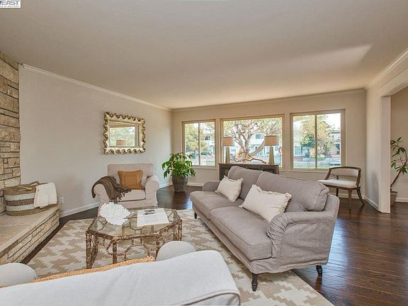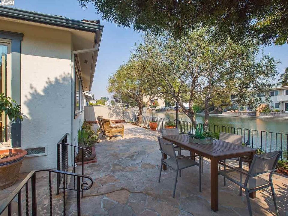 Lagoon front Mid-Century single level home on tranquil cul-de-sac. A perfect home for entertaining, this home was designed to maximize water views, with oversized windows, and rooms that flow into one another from the formal living room with a large fireplace, to the dining room that opens up to the family room & kitchen. Sliding glass doors lead from the dining room out to the spacious flagstone patio, peaceful olive trees & private dock in the backyard. Three spacious bedrooms are located down the hallway, separate from the entertaining space for added privacy. The master bedroom features on an en suite bathroom & there is an additional full bathroom located near the entry. Additional features include fresh interior paint, refinished hardwood floors, dual pane windows, recessed lighting, updated light fixtures & a 2-car garage. Ideally situated in a coveted location, strolling distance to schools, parks, the beach, shoreline trails, South Shore Shopping Center & downtown Park Street.