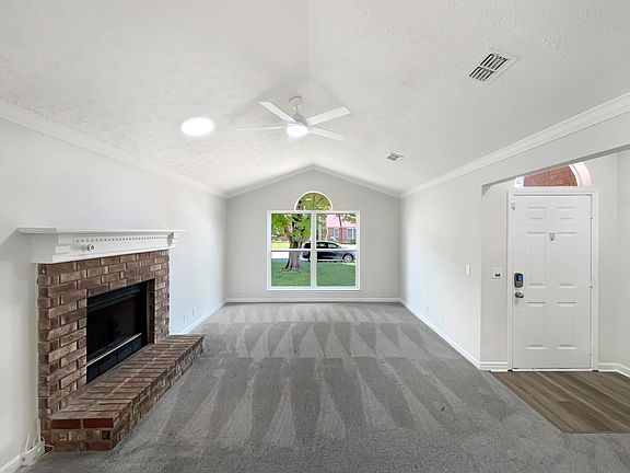 This spacious ranch features a bright and airy layout with a large eat-in kitchen boasting white cabinetry, stainless steel appliances, and plenty of room for gatherings. The open family room includes a cozy fireplace, perfect for relaxing evenings. The primary suite offers a luxurious soaking tub, separate shower, and dual vanity sinks. Step outside to a rear patio overlooking a privacy-fenced backyard—ideal for outdoor entertaining or quiet relaxation.