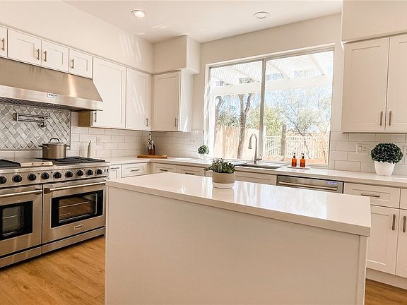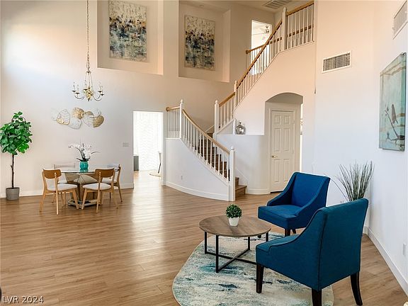 This residence is nestled in a desirably tranquil neighborhood in Summerlin with a beautiful view of Las Vegas sunset skies. The living space comes with completely updated cabinets and a renovated gourmet kitchen and is attentively designed for many nightly dinner parties to come. This home with a bedroom downstairs and a standing shower bathroom and you can walk upstairs to the primary as well as 2 other bedrooms and a large office, where all rooms come with natural light. It is convenient for all your lifestyle amenities, from parks to shopping, and easy access to the freeway. This charming home evokes style, quality and is ready to move in for the next homeowners.