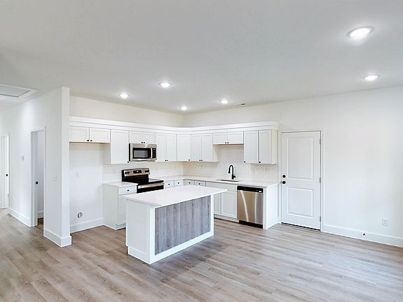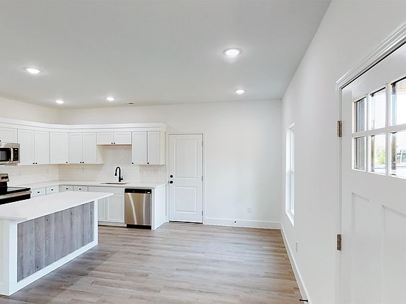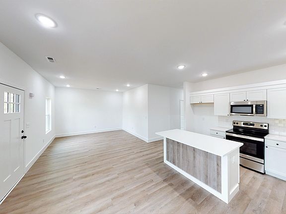 New construction! Three bedrooms two full baths. Split bedroom plan. Open concept of living space!! Kitchen features, Quartz counter tops, stainless steel appliances, island bar, recessed lighting & plenty of cabinets. Kitchen is open to dining and great-room! Patio off dining area. White kitchen cabinets. Quartz countertops. White subway tile backsplash. SS appliances, smooth top, dishwasher and microwave. Hardware will be one of two: black or bronzed. Whatever is available at time of installation. Wood shelving in all closets. No wire shelving. White interior paint on all walls and trim. Tub shower combo. Yard will be seed & straw.
