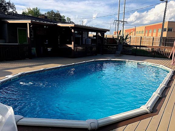 Outdoor Oasis: The private backyard retreat features an above-ground pool with a custom wrap-around deck, as well as a separate patio area – ideal for summer gatherings and relaxation.