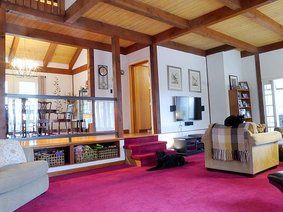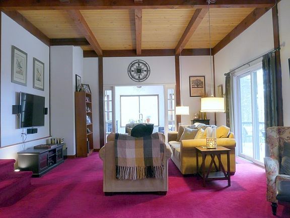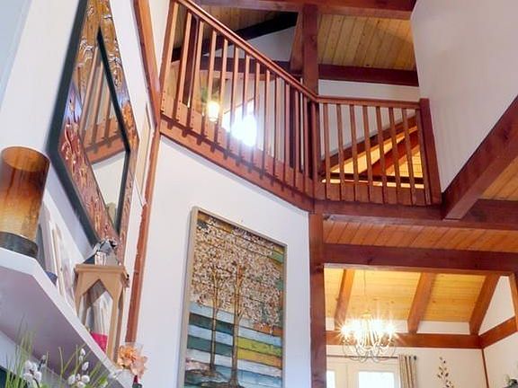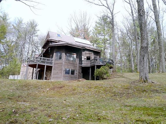 Dramatic custom built Post and Beam passive solar contemporary! Enjoy tranquil living in this special home within minutes to Amherst center and a brisk walk to the bike path.Tucked on a 3.74 Acre wooded hill lot with circular drive. The expansive updated kitchen, with breakfast nook, is ideal for entertaining and connects to one of two outside decks. A dream kitchen with an induction range and lots of storage!The open first-floor plan offers many windows and glass doors to capture exterior views. Vaulted living room with fireplace. The second floor boasts loft area with soaring ceiling with skylights and one bedroom/bath and a Master suite with cathedral ceiling, private bath, and substantial walk-in closet. In the lower level, with extra high ceilings, you will find a family room, full bath, three bedrooms.THE HOUSE IS HEATED WITH TWO WISELY LOCATED PELLET STOVES.