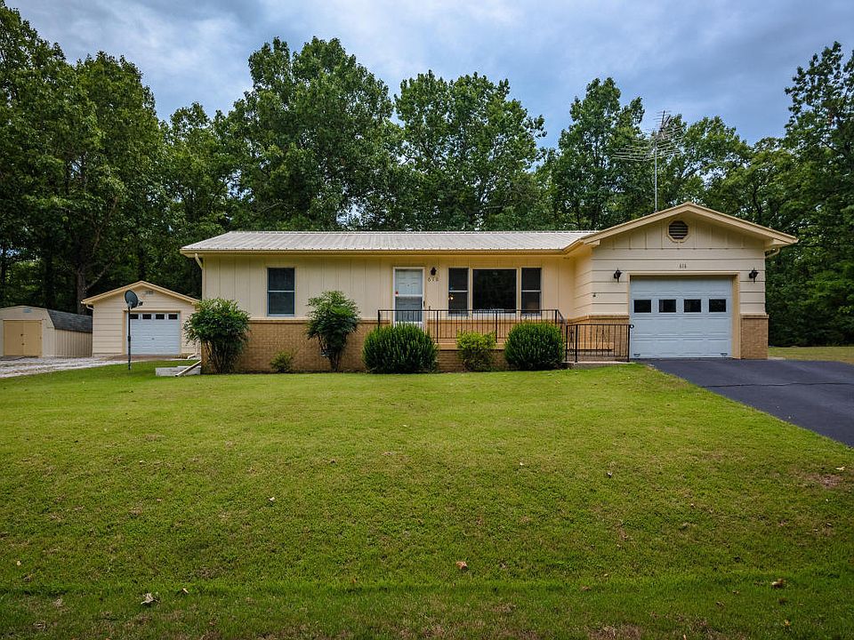 Stunning, Solid, Well-Maintained 2 bedroom 1 bath home with open floor plan, amazing sun-room and back deck all on 3 LARGE lots. Paved Street.....NO dirt roads to travel! Anderson windows. Large beautiful Trees! Workshop in detached garage or use for your boat! 2 sheds for storage! Newer Metal roof. Yard is nicely landscaped and Home is move in ready! Minutes from Bull Shoals Lake and the Golf Course! Too nice to miss!!