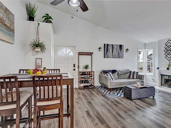 Gorgeously upgraded 2 bed, 2 bath condo with vinyl flooring, cathedral ceilings, open floor plan, recessed lighting, white cabinetry, dual pane vinyl windows, newer paint throughout, custom kitchen backsplash, newer baseboards, private patio with community views, in unit laundry, tons of closet space, & all in a prime location of Yorba Linda feeding the best schools of Placentia-Linda School District. Start with newly painted waterproof flooring, new stairs, new railing, & new light fixtures into the covered foyer entrance with smart lock and new door. Then into the totally open living room with cathedral ceilings, pristine vinyl plank flooring, privacy film on front door window, wood hearth fireplace, tons of natural light from the sliding doors to your private patio with newly painted floor, & opens to the dining area with newer lighted ceiling fan. Kitchen is totally remodeled with custom designer back splash, white cabinetry, Samsung stainless steel fridge with ice maker (2020), Samsung stainless steel gas stove (2020) with matching stainless steel vent, Samsung stainless steel dishwasher, new garbage disposal, new water pressure valve behind fridge, new paint, extra deep sink, stainless steel faucet, indented ceiling with recessed lighting, & more natural lighting from the large windows with new screens over reading bench with hidden storage. Hall bathroom is gorgeous with shower over tub, pedestal sink, newer mirrors, and medicine cabinets built in. Master bedroom is extra spacious with more cathedral ceilings, shelved storage area, new paint, lighted ceiling fan, tons of natural light plus beautiful private bathroom with extra spacious walk in tiled shower with glass doors, designer tile inlays, built in tiled shower seat, insets, vanity with tons of storage, & walk in closet with built in storage & new light fixture. Secondary bedroom is used as an office & is also large with more natural light from large windows plus has new 2 tone paint, lighted ceiling fan, & extra large closets. HOA has gorgeous pool, clubhouse, playground, &walking trails throughout. Newer water heater (2023), new light in closet by door, smart thermostat (2023), 2 car garage spot with fresh paint on ceiling and walls, new hose & hose storage, new outlet covers throughout the house with silver covers, new 2nd hanging storage rack, manual garage lock on the outside of the garage door in case of power outages so owner can access garage/cars, & tons of guest parking. A must see!