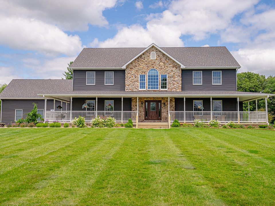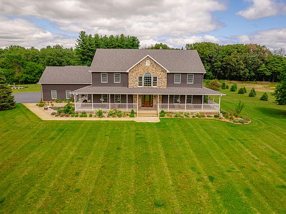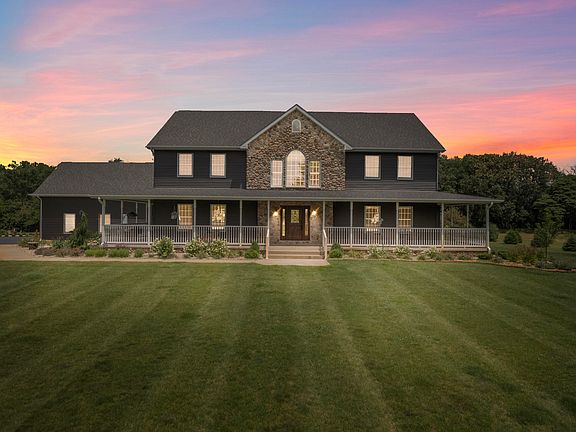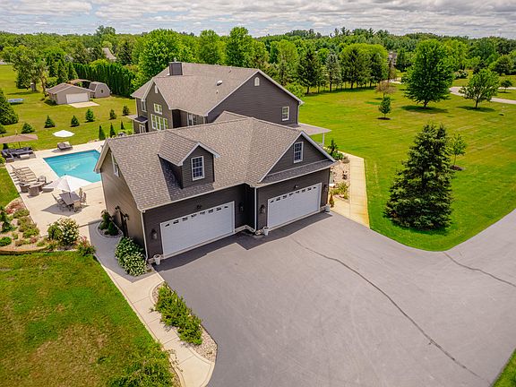 Welcome to Golf View Estates located in the premier Sandy Pines Golf Course Community. This private estate sitting on almost 5 acres has a little bit of everything. Situated on a 1/2 Ac Pond and partially wooded lot, the views from the outdoor oasis are spectacular. This open-concept home features a grand living area with vaulted ceilings and a stunning fireplace with an over abundance of natural light. Kitchen opens to a formal dining room and laundry room is adjacent to the kitchen. The primary bedroom is oversized and on the main level. Primary has attached ensuite with a large soaking tub and double vanity. Remaining bedrooms can be found upstairs with hallway overlooking the main level. The basement is made for entertaining. With a wet bar, game room, media room and gym, your options are endless. Basement also features radiant heat! Enjoy a soak in the main level hot tub then step outside and find your own paradise getaway with in-ground pool and large patio with many gathering areas. Watch the game on the outdoor TV installed poolside. Additional gatherings to be had surrounding the fire pit. Pole barn (14x30) has an attached dog kennel. Home has over $600K in upgrades over the past 2 years including new roof, new siding, 3 AC/Furnaces, 2 water heaters (75 gallons each), and a reverse osmosis system (up to 200 gallons/day). Additional features include a whole house sound system, ADT Security, Ring Security, and a Sprinkler System. Entire yard is enclosed by an Invisible Fence for your pets.