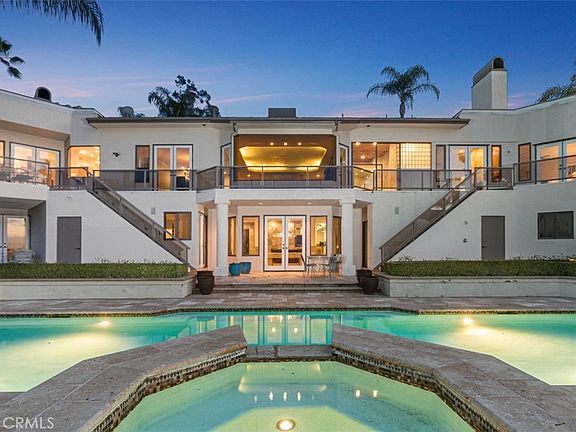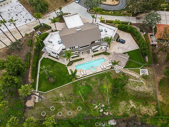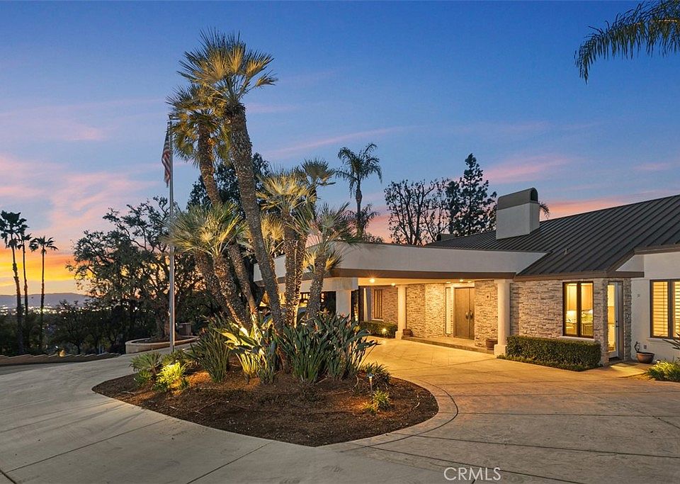 Panoramic views surround this extraordinary custom home nestled into the hilltop of Riverside’s Hawarden Hills neighborhood. This premium 50,000+ SFT lot at the top of the ultra-private Tiburon Drive. Local modern architect, Richard Frick, a protege of Clinton Marr, designed this unique contemporary residence with thoughtful modern elements. Truly one of a kind and thoughtfully constructed to take advantage of unobstructed views of downtown, Mt. Rubidoux, surrounding mountains, and the city lights. The home provides a welcome entrance with the porte-cochere that is framed with water elements providing a calming entrance and soothing sounds. The substantial bronze entry doors compliment the architecture and provide a luxurious aesthetic. The formal entry steps into a grand living room with tray ceiling, fireplace, step down bar, and floor to ceiling windows to take in the 180 degree view. The dining room provides space for entertaining and celebrating special occasions. Step out onto the veranda that wraps around the home with staircases that lead to the pool. The kitchen has been upgraded with contemporary cabinets, quartz counters, & high end appliances. The breakfast nook connects the kitchen to the family room making for a warm gathering place. The wide hallways lead to the west wing where the executive office provides an ideal place when working from home. At the end of the hall is the spa-like primary suite which is divided by a two-way slate fireplace that separates the sitting area from the bedroom. Go to sleep looking at the city lights and wake up looking at the downtown Riverside skyline. The primary bathroom has dual sinks, tub, walk-in shower and private balcony to enjoy the view. Take the elevator or head down the stairs to the lower level with three upgraded ensuite bedrooms with walk-in closets, a game room, wet bar, and fireplace. An incredible wine cellar is perfect for the family oenophile. A home gym and luggage closet complete the lower level amenities. The backyard provides an in-city oasis like a boutique resort. Covered porches, mature palms, manicured hedges, and stone tile surround the pool and spa area. The outdoor kitchen is shaded by the pergola and is the ideal entertainment space. The attached 4-car garage has plenty of storage, a workshop, and a sauna. This extraordinary residence seamlessly brings together modern architecture, premier craftsmanship, breathtaking vistas, and unrivaled privacy.