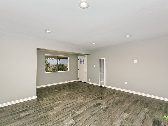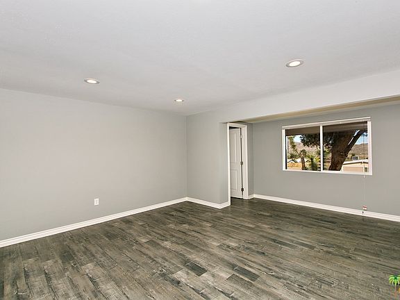 Tastefully refreshed Mid-Century Bungalow, a perfect getaway, vacation rental, or home for a first-time buyer. Beautiful wood laminate floors in gray throughout. Two ideally separated bedrooms with ceiling fans, a spacious brand new kitchen with abundant Shaker cabinet space, slab black granite counters, and stainless steel appliances. All new bathroom w/slab granite vanity. Laundry was moved from garage to newly built laundry room, with rear yard access. Recessed lighting in living room and kitchen. Fully fenced front and rear yards. Mountain views from the living room, front bedroom too. Two blocks to the entrance road to the National Park, and 5 minutes to restaurants and 29 Palms Hwy.