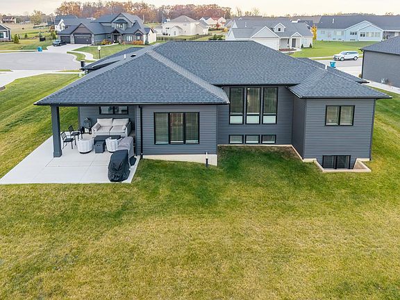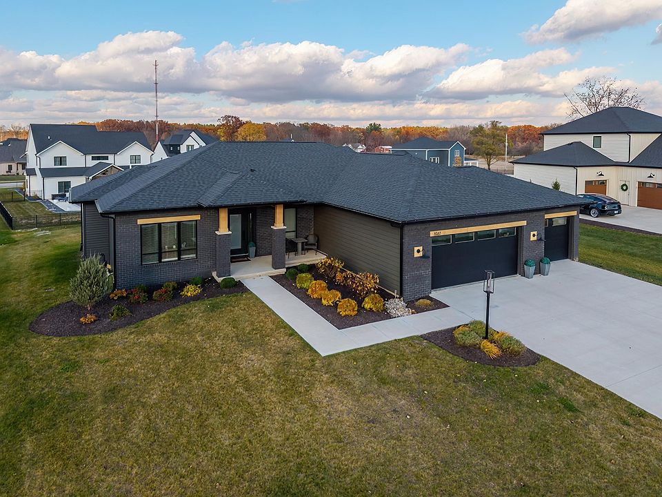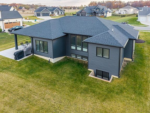 Excellent opportunity to buy a Modern Ranch on Full Finished Basement in Eagle Rock. This 3 year young home boasts striking black brick masonry with wood accents, creating a modern and stylish look. With over 3,400 square feet of finished living space, this home offers plenty of room for relaxation and entertainment. As you enter the home, you'll be greeted by a grand foyer with 10-foot ceilings, a great room featuring a custom crafted fireplace, providing a warm and cozy atmosphere. Loads of windows along the backwall from floor to ceiling. The custom kitchen is designed with maple wood island, quartz countertops, walk-in pantry. excellent low maintenance LVP flooring, and modern one-of -kind cabinets adorned with brushed bronze finishes. As you enter the home from the large 3 car garage with epoxy floor there is the guest bath, stylish lockers, and convenient utility area. The large dining area offers a walkout to the spacious oversized covered patio, providing a perfect spot for outdoor recreation and enjoying country views. The primary suite is a luxurious retreat with a black accented tray ceiling, providing a cozy and opulent ambiance. Excellent Primary bathroom suite with large Walk-in closet and amenities. On the opposite side of the home rests two bedrooms with Jack n Jill style bathroom. Lower level has lots of natural light and has large Rec room, workout area, Additional 4th bedroom, Full bathroom, and storage rooms and shelter room. High quality mechanicals with irrigation and security are included. Leo schools and super close to Parkview Hospital and all the new restaurants and shopping.