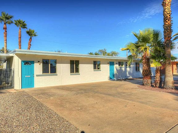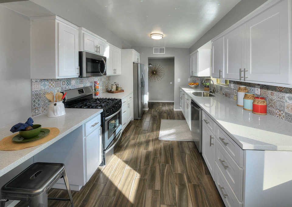 This 4 Bedroom/2 Bath Home has carefully enjoyed a full renovation including all new: roof/fascia, exterior/interior paint, custom ceramic tile & carpet throughout home; Quartz counters in kitchen & both baths; stainless appliances including gas range; hot water heaters; hvac updates; and windows. The floor plan features an enormous Great Room with wood grain tile, gas fireplace with stone tile surround; master BR suite; 4th BR with walk in closet & exterior access for many potential uses; over sized laundry room; spacious AZ room; and kitchen with breakfast bar/workspace. The home also has central AC, a storage shed, and plenty of parking.