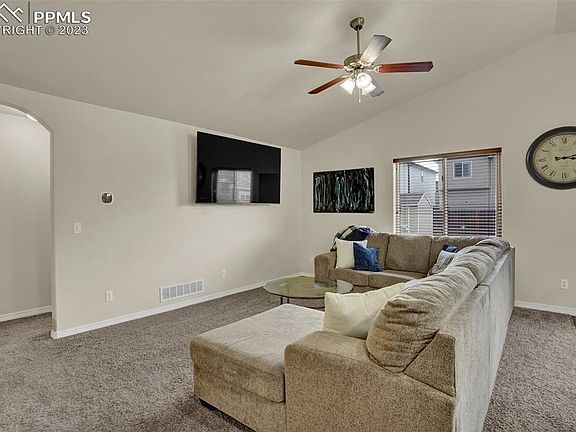 Beautifully maintained main level living in Lorson Ranch- this is the home you have been waiting for!! Immediately get drawn in by the stunning curb appeal of this Lowell floor plan ranch style home, featuring 4 bedrooms, 3 full baths, a two car garage, and a large finished basement. Entering thru the front door, you will be greeted by the bright and open floor-plan, perfect for entertaining and everyday living. On the main level, you will notice LVP in the kitchen/dining area and vaulted ceilings in the entryway and living room, allowing for tons of natural light to pour in. A secondary bedroom, which can also double as an office, is located near the front of the home, while the first full bath is just outside of the bedroom. As you continue in, you will find yourself in the open concept living/dining/kitchen space. Don't miss the designer kitchen, boasting stainless steel appliances, 42” upper cabinets with crown molding, and a large kitchen island, perfect for barstool seating. Adjacent to the kitchen is the cozy living room, allowing for open sight lines throughout the main level. Head outside to the large concrete patio complete with a shed. Continue on inside to the main level master which features tall ceilings and a 5pc en-suite bath. Enjoy small touches such as recessed lighting and lighted ceiling fans in the great room & master. Designed with convenience in mind, the laundry space is located near the master w/ access to the garage. The open floor plan continues downstairs to a spacious rec room with ample amounts of space to entertain or gather with family. The basement also includes two large bedrooms equipped with walk in closets and an additional full bathroom. The entire basement also boasts a unique painted concrete flooring finish. A utility room in the basement offers additional storage. Near schools, parks, walking trails, & a very easy drive to Mesa Ridge shopping, all military bases, & easy access to all Powers Blvd amenities!