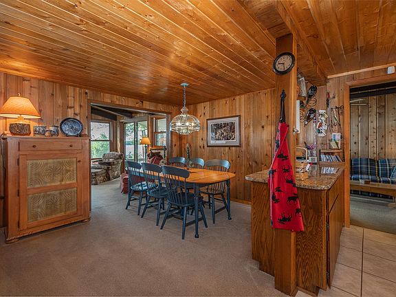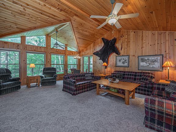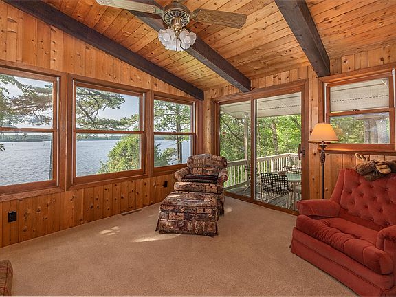 Everyone can mingle between the living room, family room, and sitting area; all are on one level. The peaked ceilings and knotty pine throughout give the home a warm, open feeling. Large dinners will be a breeze with the pass-through from the kitchen to the dining room. Spread out onto the large deck and enjoy your view and 200’ of shoreline; or sit around the fire next to the water and listen to the waves while making new memories. The owner’s suite has its own en suite, adorned with granite countertops. The lower level is perfect for family and friends with room for several beds and its own 3/4 bath. AND, with its own furnace, everyone’s comfortable. The huge yard is great for family fun. Your shoreline is hard bottom and is great for swimming; the shed by the water can hold all of your lakeside necessities. This home has a 2 stall garage with an additional shed for storage.