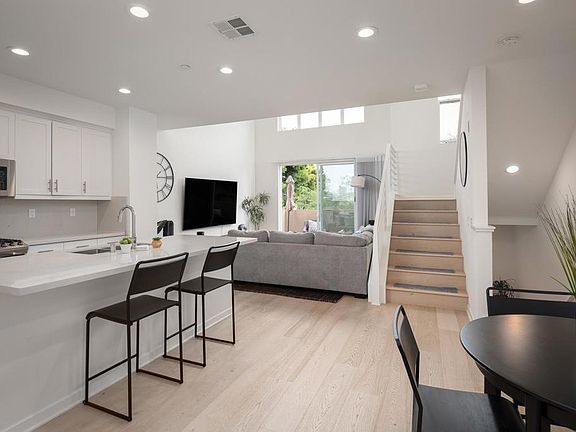 This light and bright townhome has the modern, fresh finishes you have been looking for! This home offers an open great room concept complete with kitchen island, quartz countertops, soaring living room ceilings with an abundance of natural light, hardwood floors and a balcony ideal for morning coffee or entertaining friends. One bedroom and one bathroom can be found on the main level, with the primary bedroom and bathroom upstairs complete with walk-in closet. Just off the primary is a fabulous flex space ideal for a home office. Downstairs is the attached two car garage with Epoxy floors and an additional bedroom and bathroom. Truly resort style living with palm tree lined community pool and BBQ area. Located in Kensington at the Square, adjacent to Bressi Ranch with excellent dining and shopping options, all within walking distance from this upgraded and modern home.