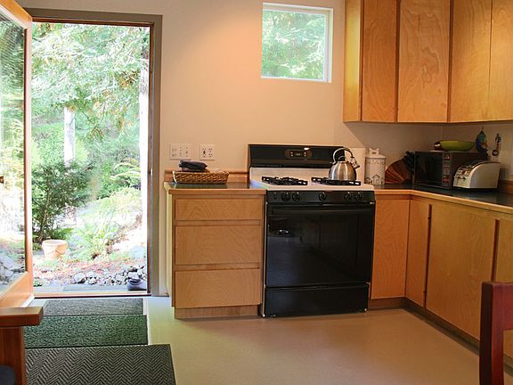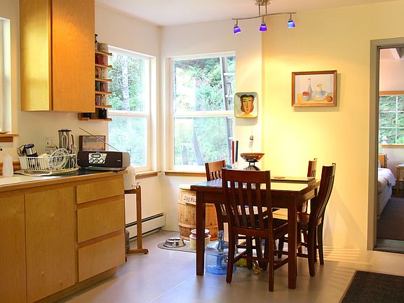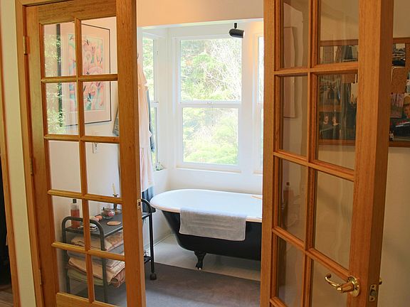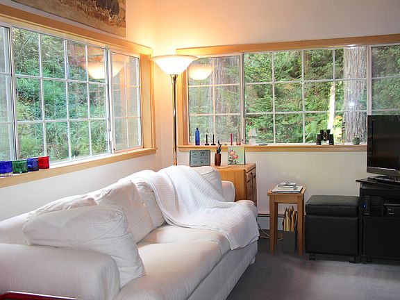 Tranquility abounds in this custom tree-fort style house. Kitchen, living room with wood stove, 1 bedroom and 3/4 bath downstairs. Upstairs opens on to a large landing that could be a sitting room, french doors lead into a full bath with a clawfoot tub surrounded by windows on 3 sides. Also 2nd bed and a pass-thru to the loft over the living room are found upstairs. Lots of windows, interesting angles, and spaces abound that make the spaces feel bigger. Old trailer has no value but produces $450/mo as a rental/storage area. Electric privacy gate, and house sits back from the road. Tributary creek flows through the property down to Jacoby Creek (which is the southern property line). Property encased by City of Arcata Forest on 3 sides. Square footage, lot size, & age per County.