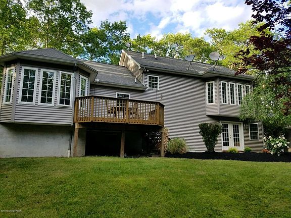 This Lovely Split Level home is located in the quiet, yet convenient neighborhood of Old Orchard Farms. Walk right in from the covered front porch into the spacious Family Room. French doors open to the large yard with flowering trees. Nice Open Kitchen with breakfast island, ample cabinets, new dishwasher and microwave. Sit by the Living Room Gas Fireplace, enjoy the Natural Lighting from the Large Windows and Skylights. Step outside from the Breakfast Nook onto a Large Deck. Three good sized Bedrooms and Three Full Baths. Special Features include Pergo Floors, 2 Car Garage, Shed, and located at end of Cul du Sac. Convenient to Route 80 and All Pocono Attractions. Call to schedule a private showing.