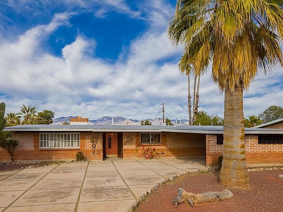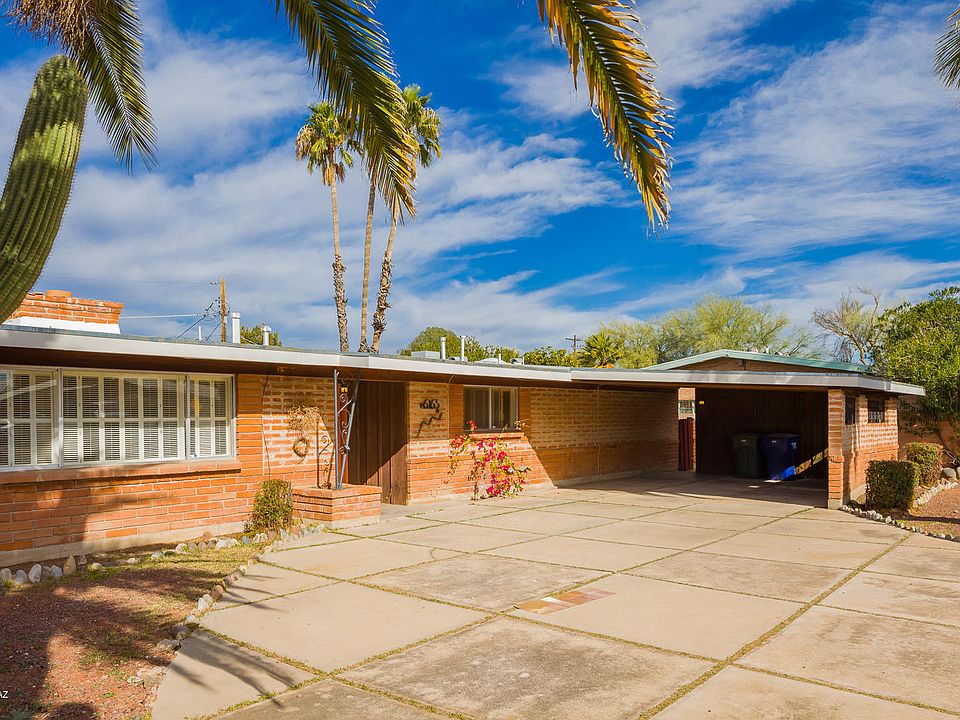 If you are looking for an unspoiled mid century modern home in an outstanding central Tucson location, this is it! Located on a high lot, this burnt adobe home has been loved for many years and now is available for you! The low care landscaping includes a fine Saguaro. Lots of space for parking on the generous front driveway and two car carport, Inside, the front entry boasts a flagstone floor and a wall of bookshelves. Well cared for Saltillo is throughout, with the exception of the kitchen floor, which is vinyl.. The kitchen is galley style, with retro appliances and cook top. There is formal dining, an interesting corner fireplace in the living room, and a family room with a wall of bookshelves.There is a skylight in the hall bath. The master bedroom has back yard access. A must see!