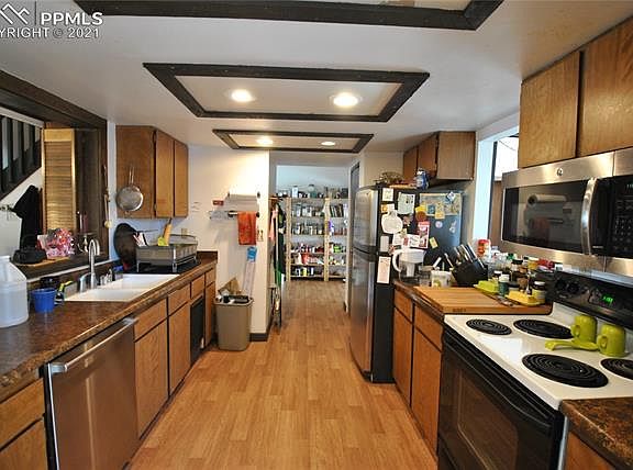 LOTS OF SQUARE FEET for the money. This DIAMON IN THE ROUGH is on a great treed lots with Mountain Views. 4 Upper bedrooms and huge master suite with big walk in closet, fireplace and full bath. The garden level basement has a huge rec room that's currently a package shop plus another big bedroom and full bath with 2 sinks. The oversized garage has a built in shop. Roof was done in 2015. Furnace in 2002. Look past the clutter and this could be a real jewel. "DONT GO ON THE DECK"
