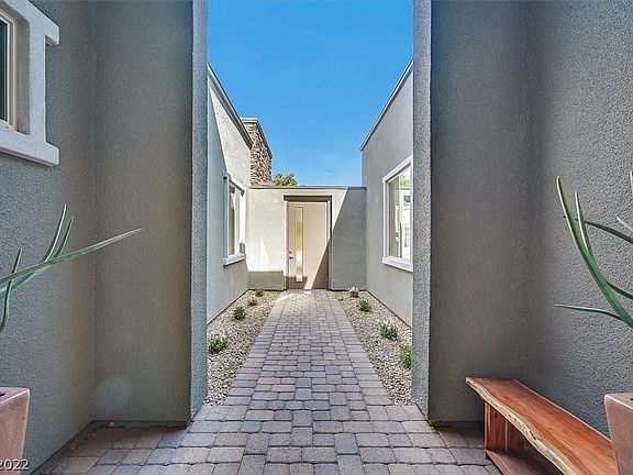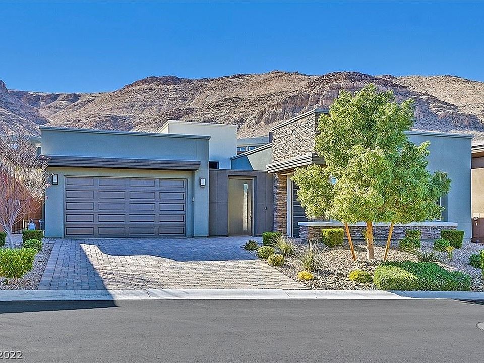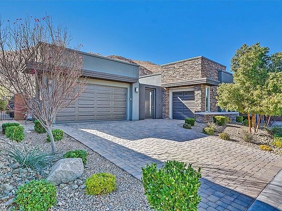 Stunning mountain views from the highly upgraded Toll Brothers home. Open great room concept with the entire back wall corner pocket doors open completely towards the back yard w/mountain views , high ceiling in great room and kitchen, large island featuring breakfast bar, high-end cabinets, S/S appliances, pantry. Primary suite boasts a tray ceiling, sliding door, magnificent bath w/ w-in shower & drying area & w-in organized closet* 2 additional bedrooms with w-in closets and bath. Imagine sitting under covered patio with electronic shades in the evening watching the sun set *The large lot also includes low maintenance landscaping* Garage with epoxy flooring, Cooling and heating system, tankless water heater*Speaker system, dimmer switches, Alarm system* Walking paths, large parks, walking distance to Bishop Gorman,