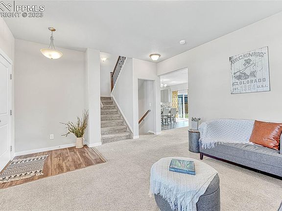 Discover comfort and luxury in this exceptional two-story home. With 5 bedrooms, 4 bathrooms, and 3,373 square feet of living space, this 2020 built residence in Lorson Ranch is truly extraordinary. Step inside and be greeted by a welcoming formal living room. The open-concept design seamlessly connects the kitchen, dining, and living areas, creating a spacious and inviting atmosphere. The kitchen features granite countertops, a granite backsplash, an island with cabinets, stainless steel appliances including a gas range, a stainless steel undermount sink, recessed lighting, brushed nickel cabinet hardware, and a walk-in pantry. Indulge in the luxurious bathrooms, as well as the additional features of this home that include luxury vinyl plank flooring, a radon mitigation system, and mountain views from the front. Upstairs, the primary bedroom awaits, offering a serene retreat. It boasts a cozy sitting area that can be used as a study or office, a 5-piece en suite bathroom, and a walk-in closet. Completing the upper level are three additional bedrooms, a full bathroom with double sinks, a spacious loft, and a large laundry room with wire shelving. The finished basement adds even more living space, showcasing a fifth bedroom, a sprawling family/rec room perfect for entertaining, another full bathroom, and an oversized utility room that provides ample storage options. Outside, enjoy the covered front porch and fully fenced backyard, providing privacy and tranquility. The automatic sprinkler system ensures effortless lawn maintenance. Other notable features include a garage service door, A/C, ceiling fans, two-panel doors, a sump pump, a Ring doorbell, and more. Situated in a location near parks, schools, recreational facilities, shopping centers, restaurants, military bases, and entertainment options, this home offers convenience at its finest. Don't miss this chance to make this exquisite property your dream home. Schedule a showing today and seize the opportunity!