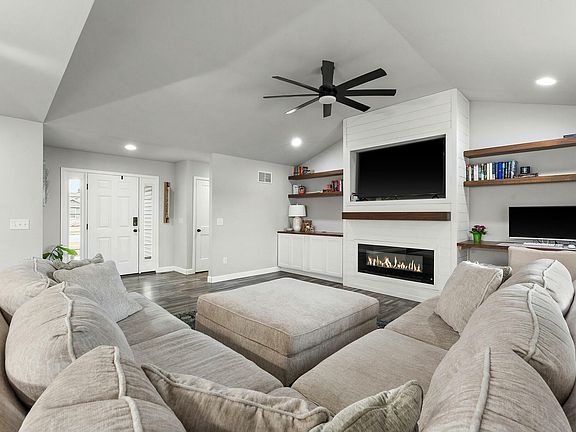 - Description: Vaulted ceiling, open concept living/dining, built in shelves, gas fireplace w/ shiplap chimney, recessed lighting