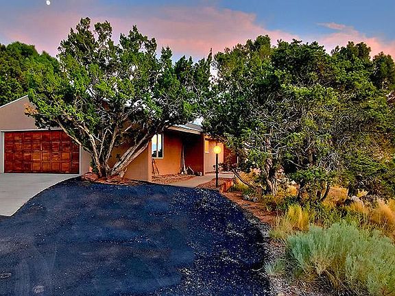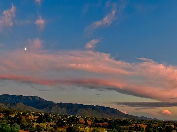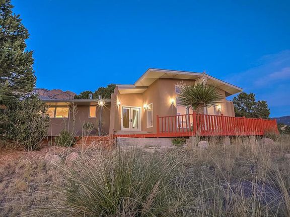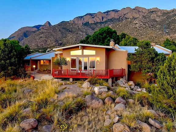 Distinctive Sandia Heights! Finest, Modern Contemporary SW Custom Perched High Overlooking the City Lights, Sunsets & Sandia Mountains from Indoor & Outdoor Patios & Decks! Secluded entry, large country kitchen w/ample cabinets & counter space, entertainer's wraparound bar, views, huge glass door pantry w/great storage, elegant formal dining room w/custom chandelier & views, open entertainer's floorplan w/lots of light & views! Greatroom w/custom stove/fireplace, raised cathedral ceiling & views. Living room opens to greatroom w/Kiva fireplace & views, perfect for entertaining. Office nook off living spaces, separate main floor Master w/private bath & walk in closet, lower level den/study w/outdoor access + 2 guest bedrooms & bath, decorator accents throughout. Panoramic Views Abound!